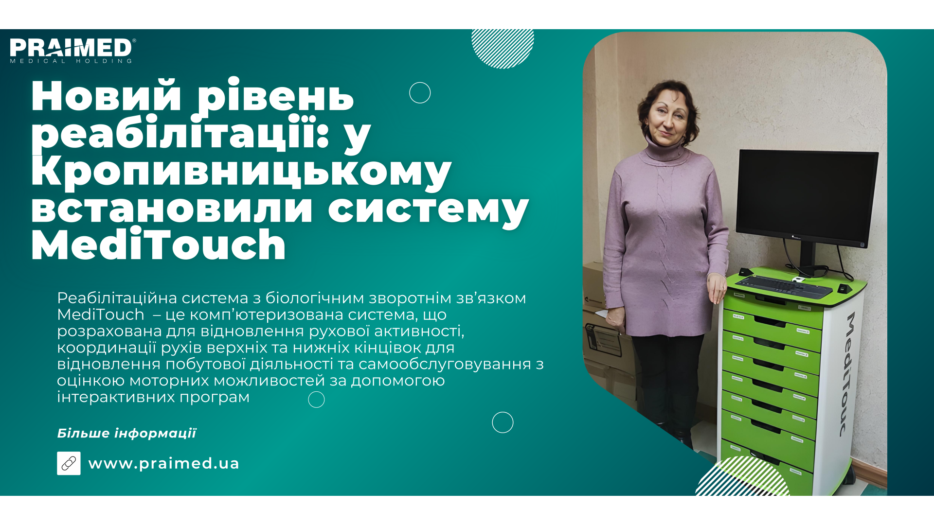 Це перша подібна система в місті, яка використовує технологію біологічного зворотного зв’язку для покращення ефективності реабілітаційного процесу пацієнтів.Система MediTouch розроблена для допомоги пацієнтам, що проходять відновлення після травм чи операцій, а також тим, хто має хронічні захворювання опорно-рухового апарату. Вона використовує сучасні технології для моніторингу та аналізу рухів па..