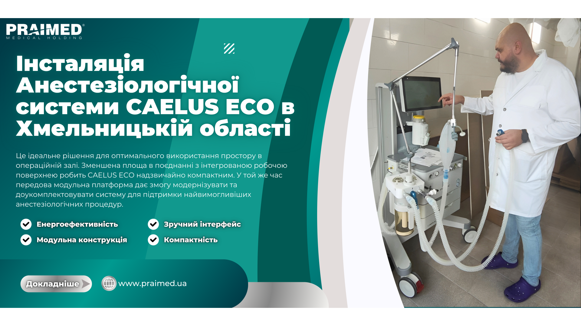 У жовтні 2024 року в Хмельницькій області успішно завершено інсталяцію сучасної анестезіологічної системи CAELUS ECO від провідного європейського виробника. Це обладнання стане важливим доповненням для операційного блоку медичного закладу, значно підвищивши рівень безпеки та ефективності надання медичних послуг.CAELUS ECO відзначається енергоефективністю, низьким рівнем споживання анестетиків та с..